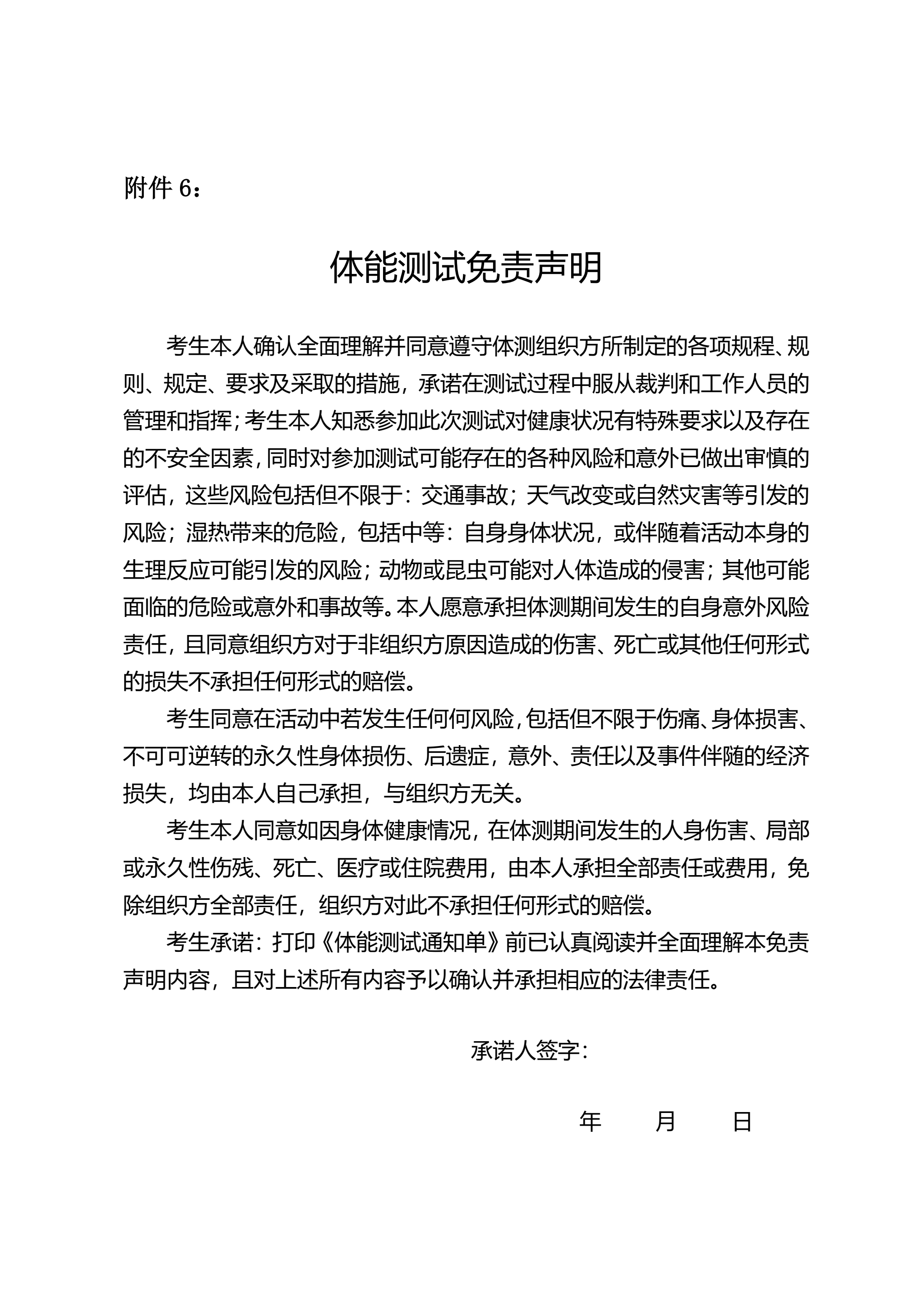 考生考试当日须携准考证和本人身份证参考,着运动服、运动鞋,须提前自行下载打印并签订《体能测试免责声明》(附件6),于考试当天交给考务人员。如有身体不适合参加体能测试的疾病或存在其他身体不适情况的,应提前告知考务人员退出体能测试。