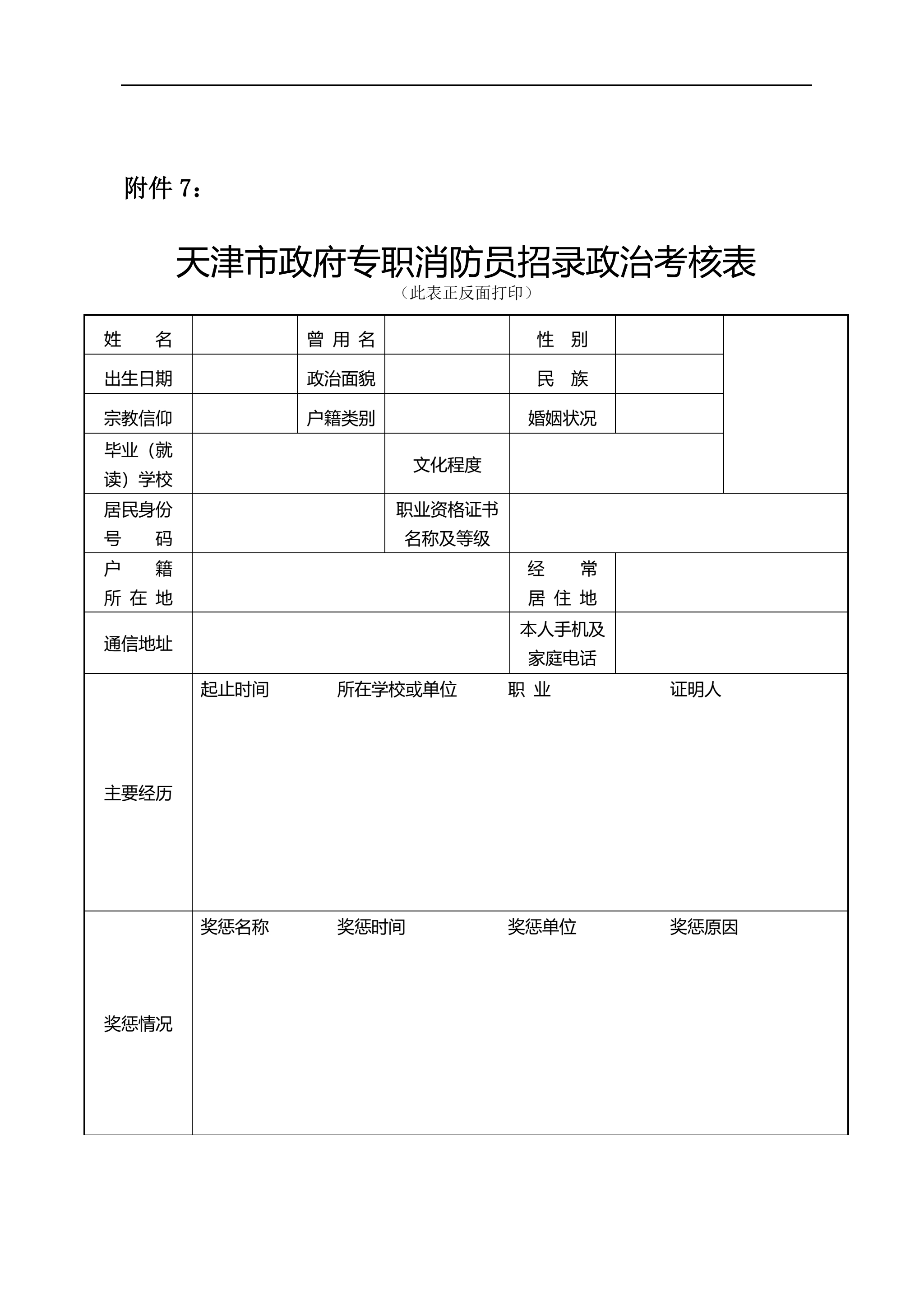 按照天津市政府专职消防员招录政治考核要求进行,考生应如实填写《政府专职消防员招录政治考核表》(见附件7),或自行准备相关佐证材料附该表后: