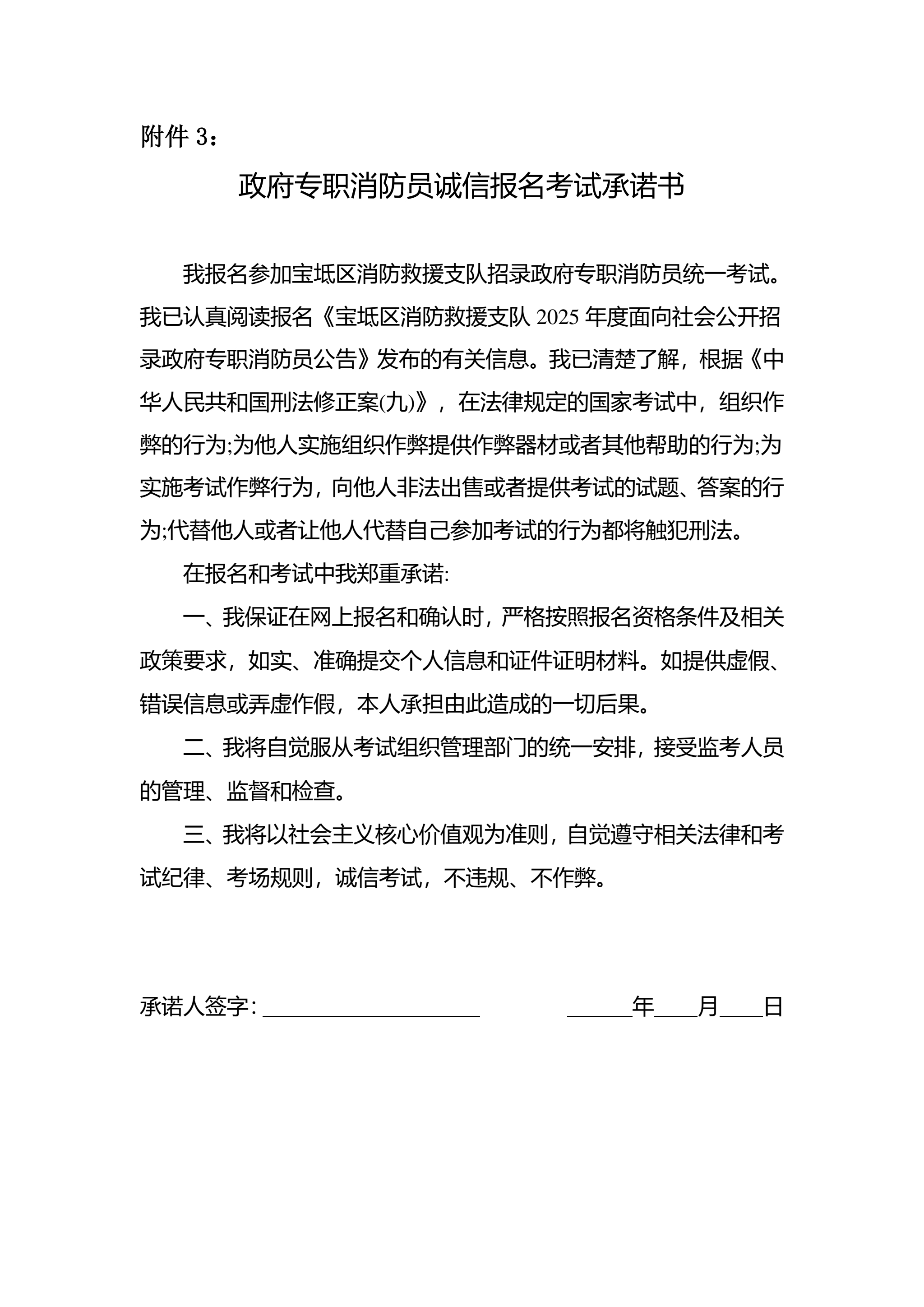 考生应如实填写《宝坻区消防救援支队政府专职消防员报名登记表》中的相关个人信息,将本人近期彩色1寸正面免冠蓝底照片电子版上传至报名表相应位置。对所提供的信息履行真实性承诺并签订《政府专职消防员诚信报名考试承诺书》(见附件3),对提供虚假报考申请材料的,一经查实即取消报考资格。对伪造、擅自涂改有关证件、材料、信息,骗取考试资格的,将按照有关规定予以处理、追究,后果由考生自负;考生应随时关注网站发布的消息并保持报名表中填写的手机号码畅通,因个人原因未能参加考试或现场资格审查不实所产生的后果,由考生自负。