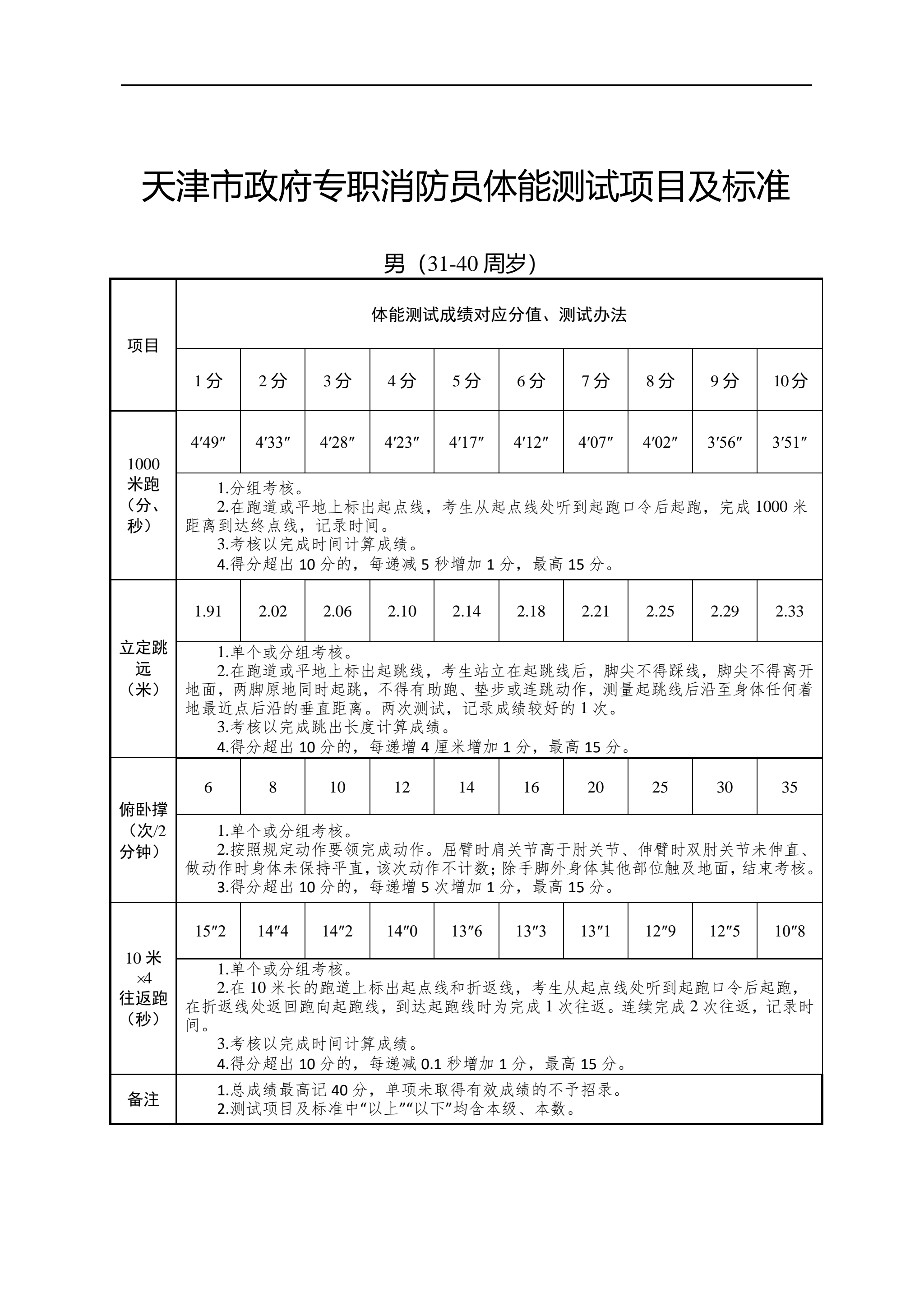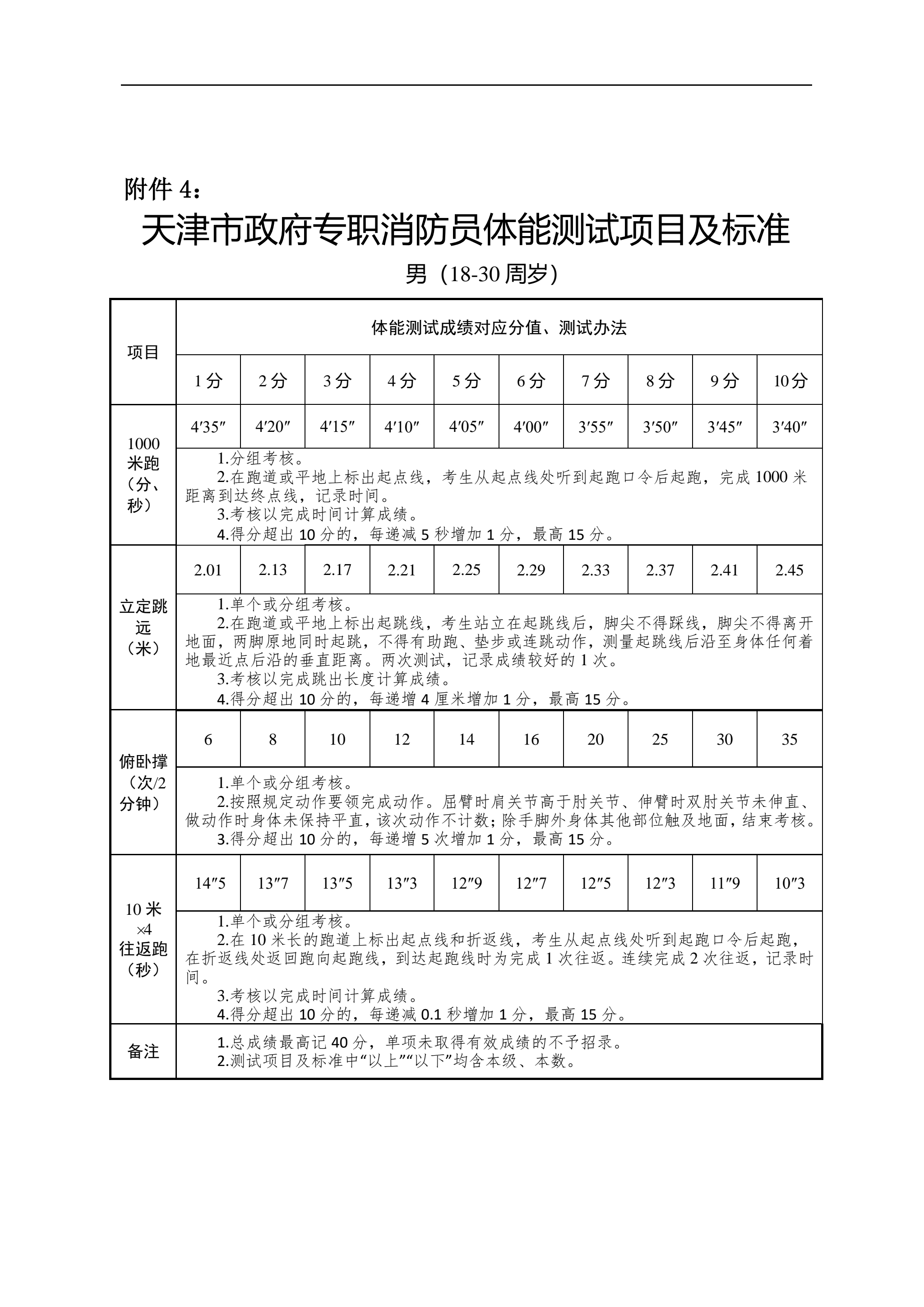 体能测试和岗位适应性测试标准按照《天津市政府专职消防员体能测试项目及标准》执行(附件4、附件5),均实行量化评分。其中:体能测试单项有效成绩为1分~15分,总成绩最高记40分;岗位适应性测试单项测试成绩达到一般、中等、良好、优秀等次的,分别计2.5分、5分、7.5分、10分,总成绩最高40分;体能测试、岗位适应性测试任一单项未取得有效成绩的,不予招录。